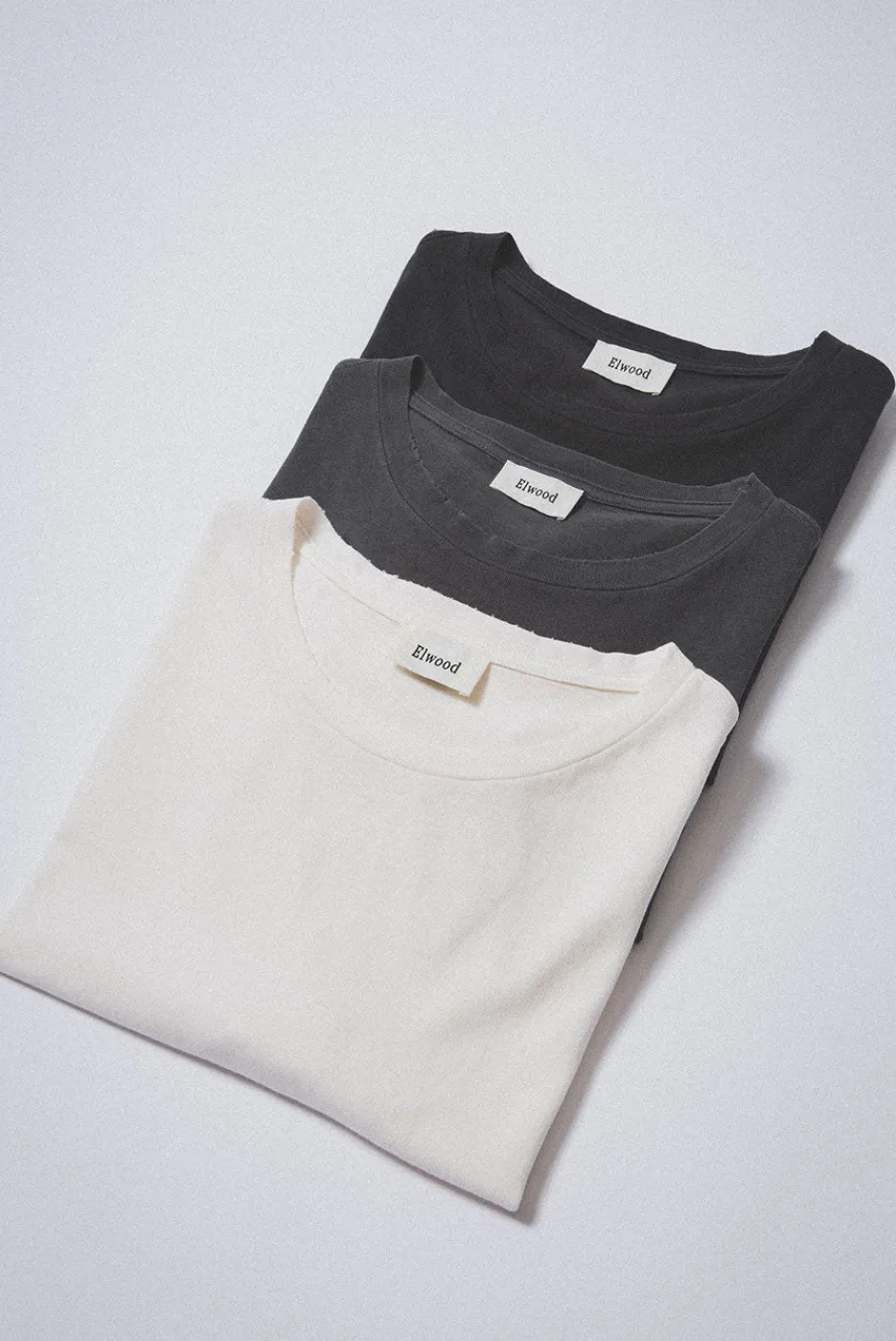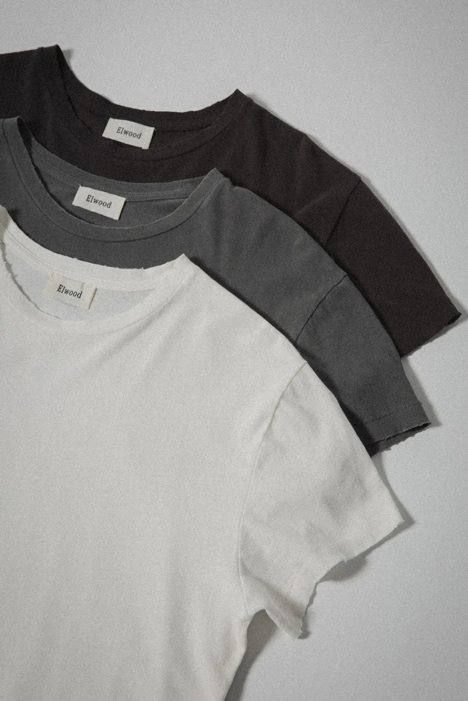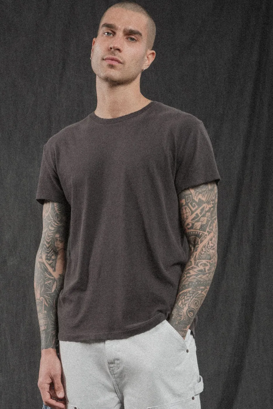 A vintage-inspired tee with a standard fit, cap sleeves, and slightly longer and slimmer proportions. Made with hand-distressed garment washed 100% cotton jersey.
