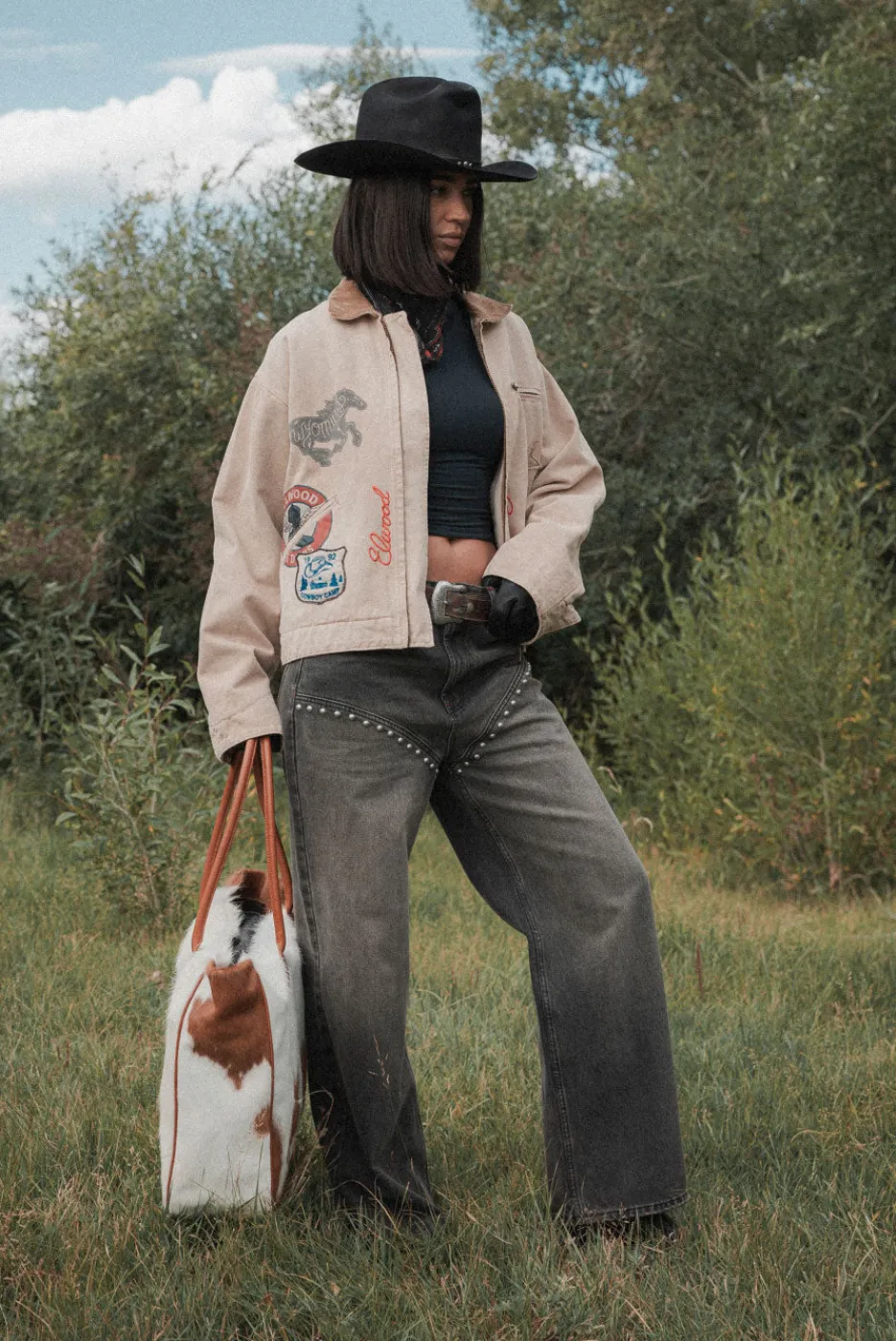 These baggy-fit denim pants are inspired by classic Western chaps and feature studded details, lasso embroidery on the rear pocket, and custom hardware. Available in Worn Out Wash.