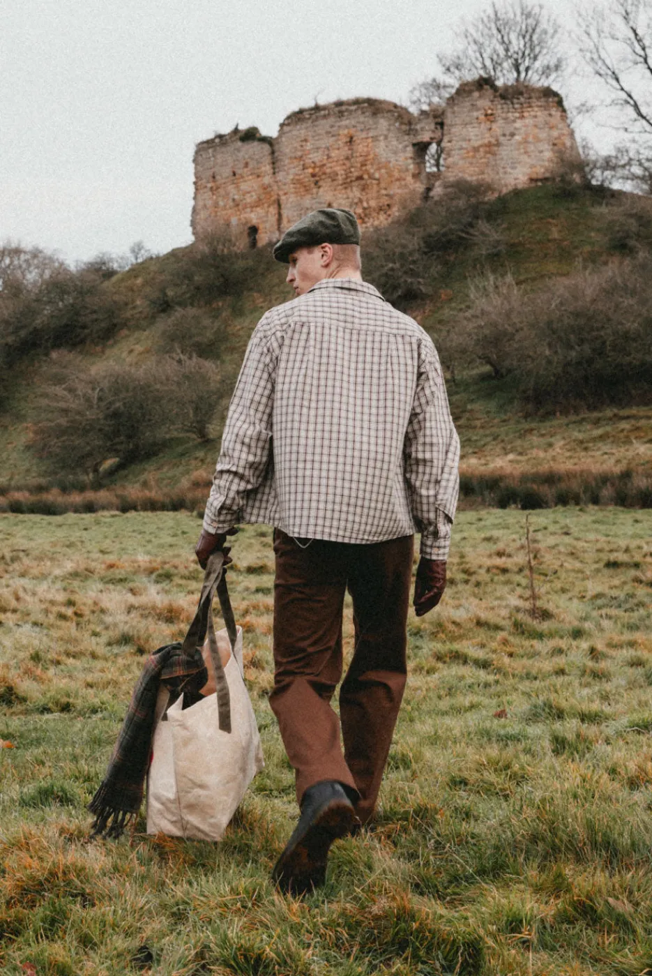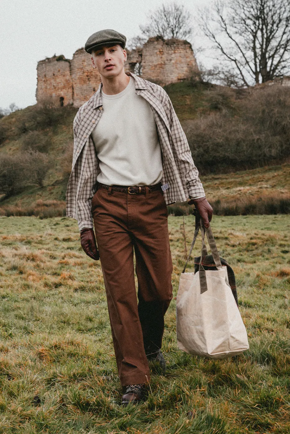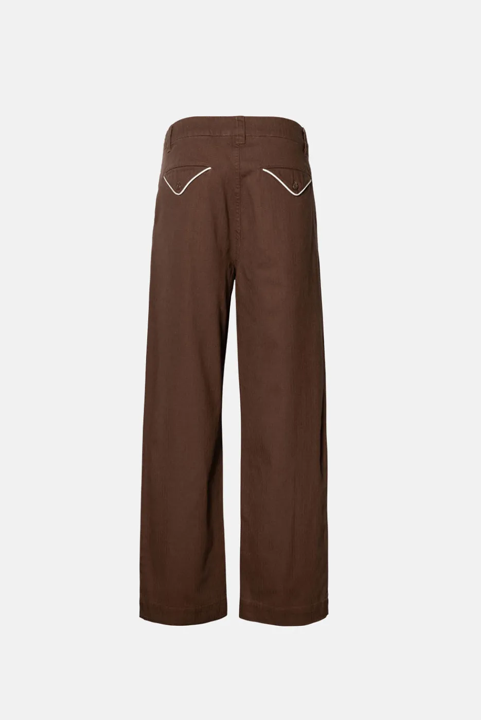 The Groundskeeper Pant is crafted from textured herringbone twill fabric for both durability and style. Features a straight-leg fit with subtle piping details on the back pocket. Available in Off White and Bark.