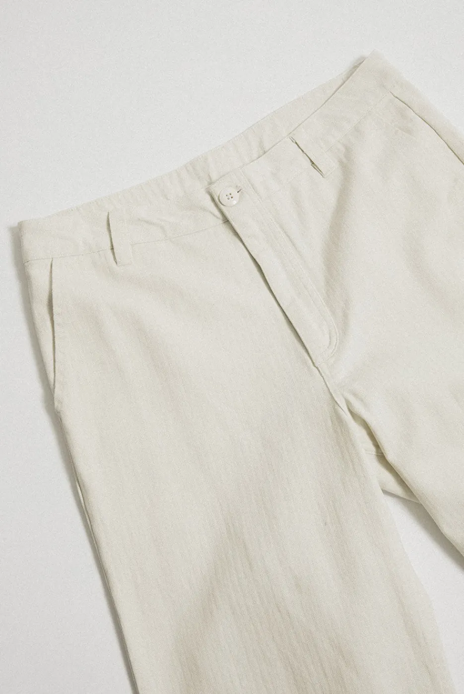 The Groundskeeper Pant is crafted from textured herringbone twill fabric for both durability and style. Features a straight-leg fit with subtle piping details on the back pocket. Available in Off White and Bark.