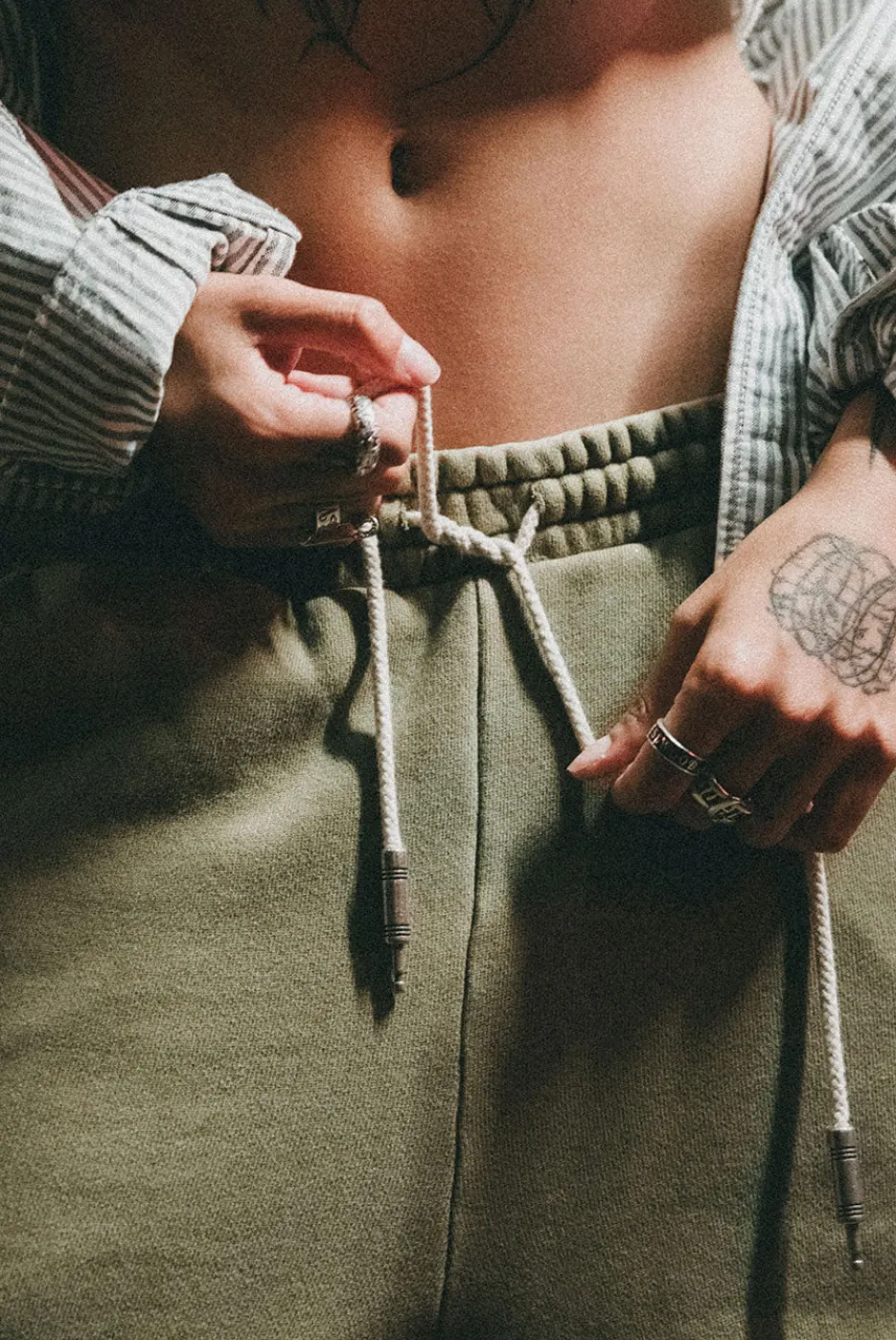 The Metal Sweatpants are a grunge-inspired take on our best-selling straight leg sweats. Mineral washed to obtain a vintage look, with naturally occurring highs and lows. They have a baggy fit, raw canvas edge detailing, and amp cord-style drawcord endings. Available in Olive and Slate.