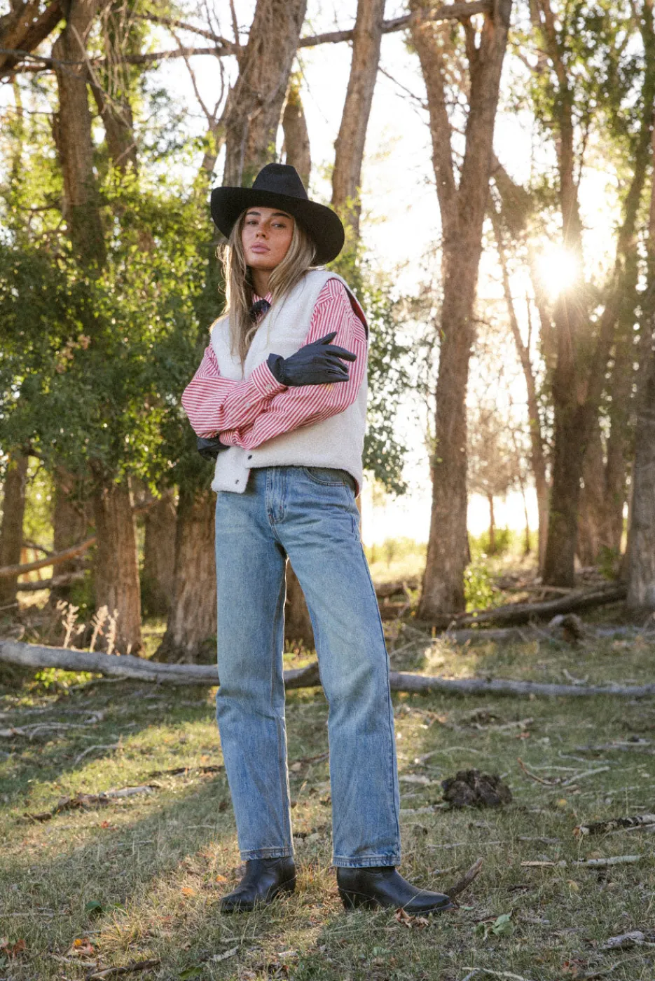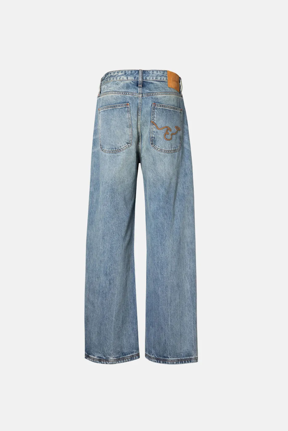 A timeless straight-leg denim pant with signature red bar tacks and lasso embroidery on the back pocket. Features custom hardware and a mid-rise. Available in Washed Black, Vintage Indigo, and Pond Wash.