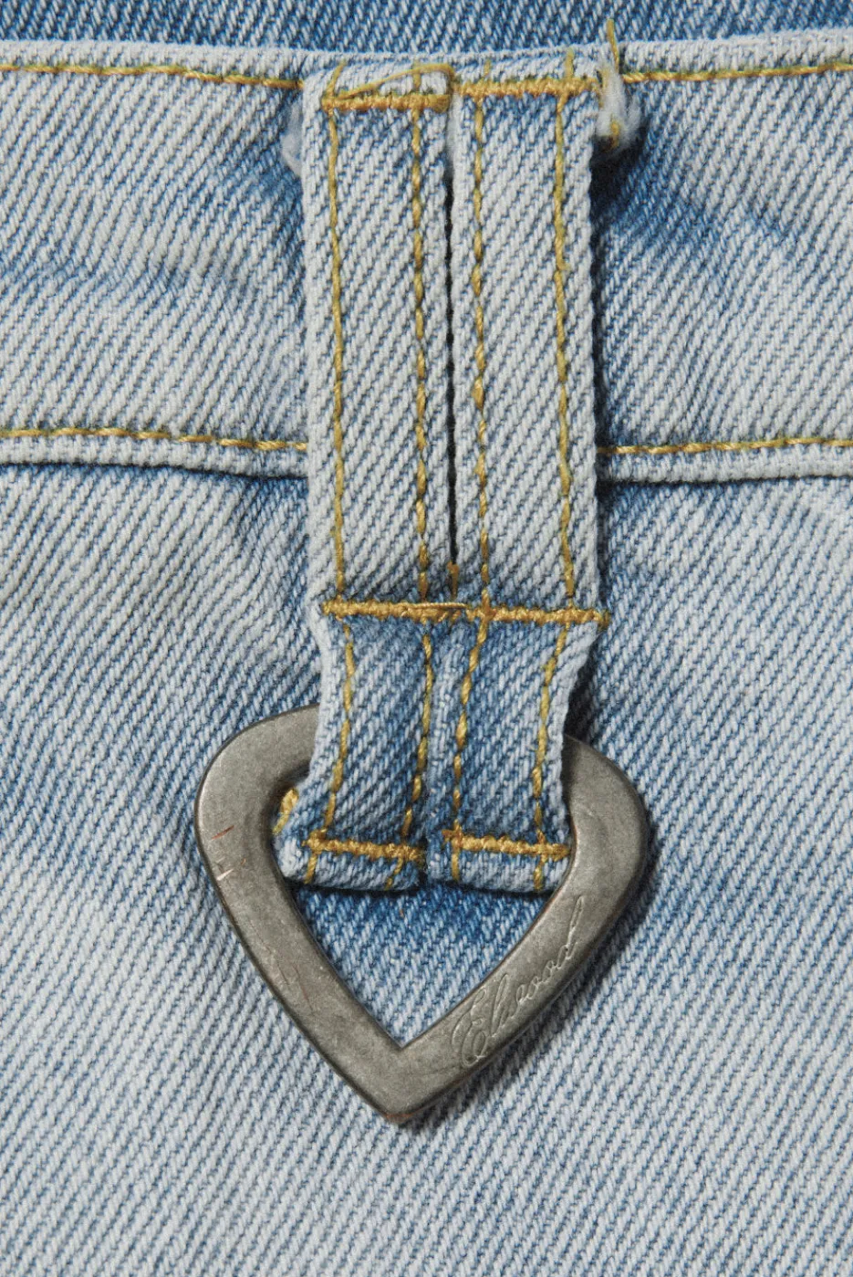 TRAPEZOID SHORT The Trapezoid Short gets its name from the wide-leg cut that tapers in at the waist with sewn darts. Key features include a double belt loop with keyring, custom Elwood hardware, and a genuine suede back patch. Available in three washes.