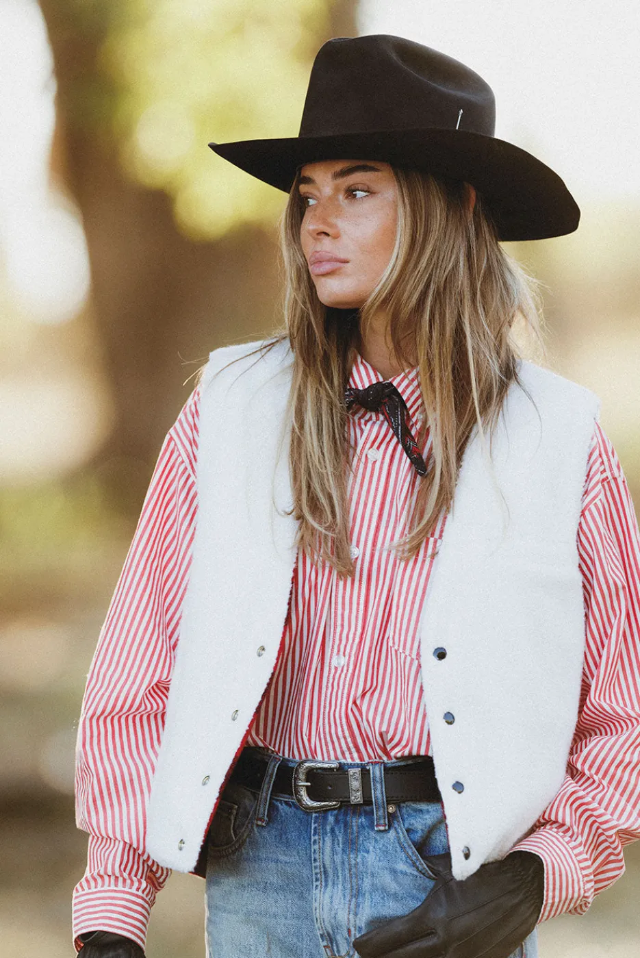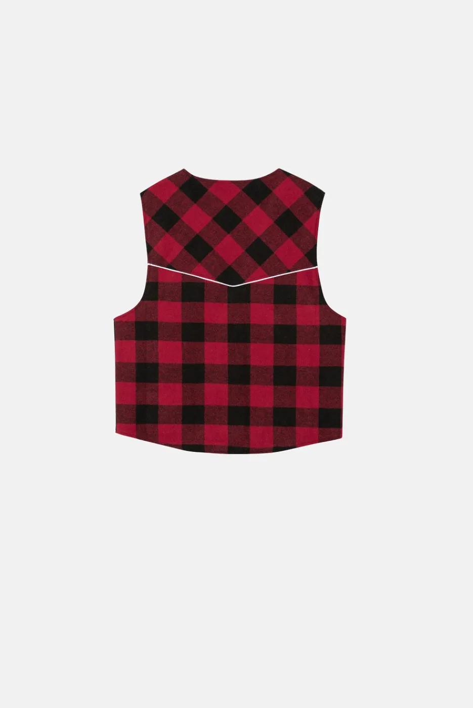 This reversible vest features plaid on one side and warm sherpa on the other, making it versatile and functional. It includes front piping, welt pockets, and snap buttons for a classic touch. Available in Buffalo Plaid.