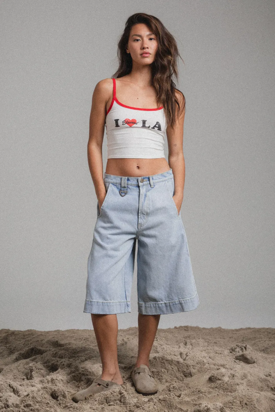 CAMI TANK The hottest days call for the Cami Tank. Cropped with contrasting spaghetti straps, each colorway features a custom Los Angeles-themed screenprint. Available in two colors.
