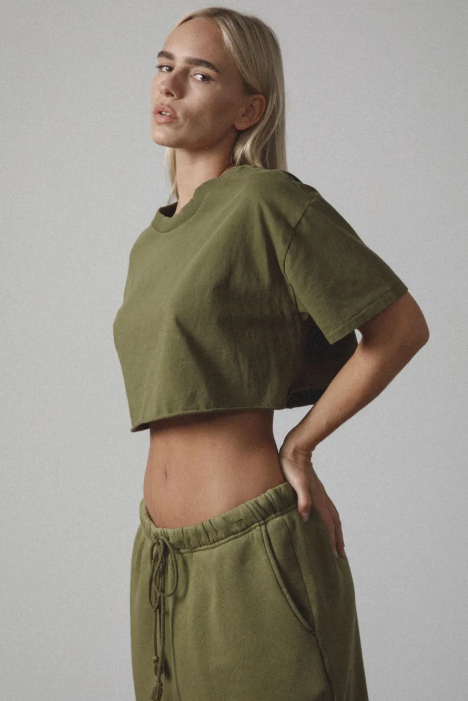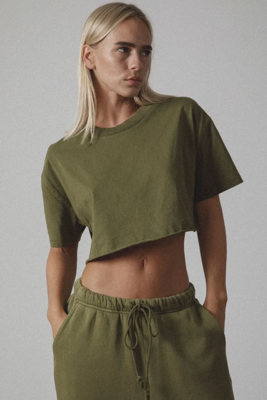 A super-cropped variation on our best-selling Core Tee, designed to hit at the ribcage. Vintage-inspired, featuring hand-distressed details and a raw edge hem.