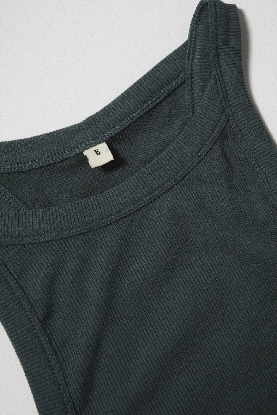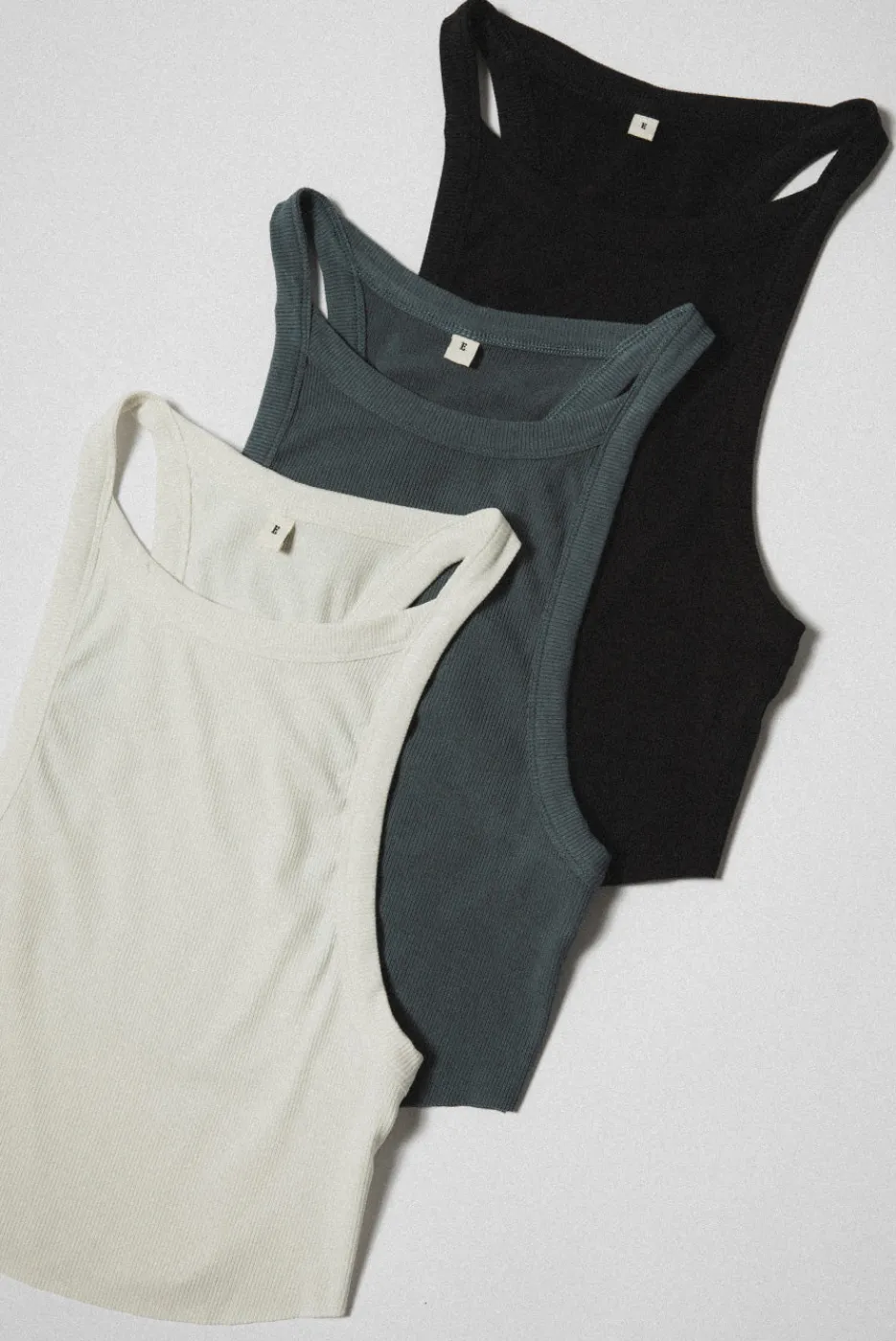 A racerback tank made from a thin, lightweight fabric with narrow straps. It features a high-neck design, roomy armholes, and a curved hem. Available in Lotus, Coal, and Slate.