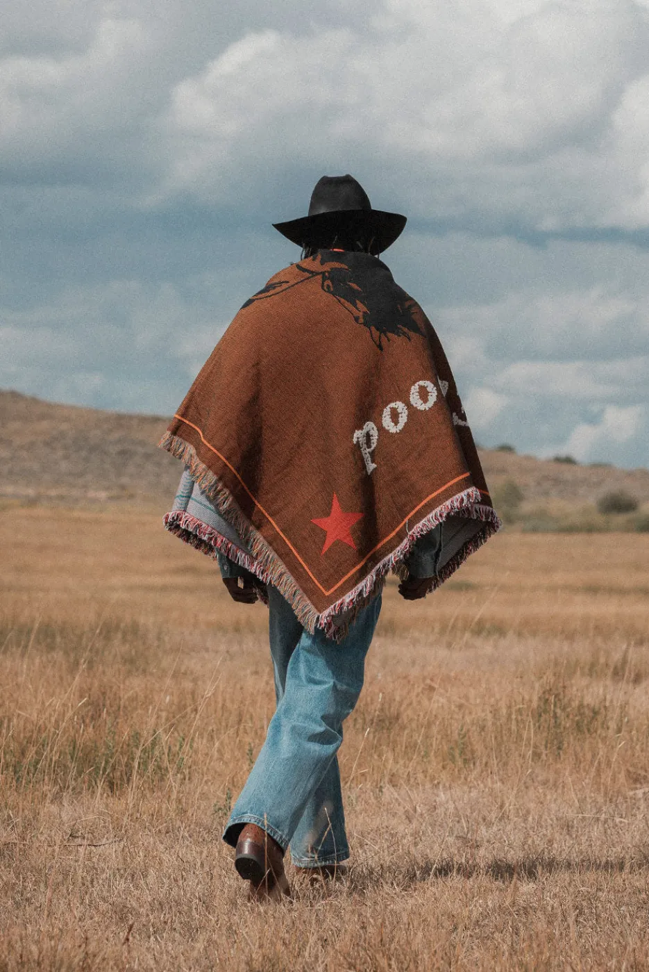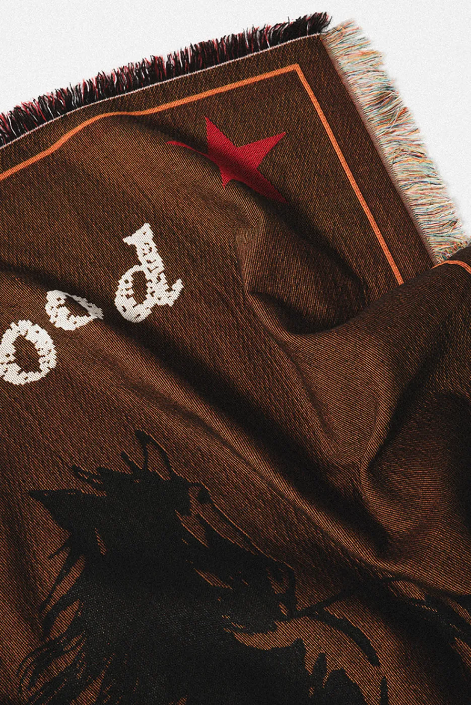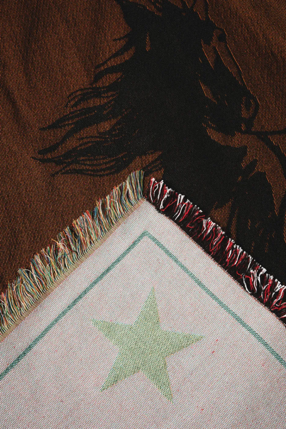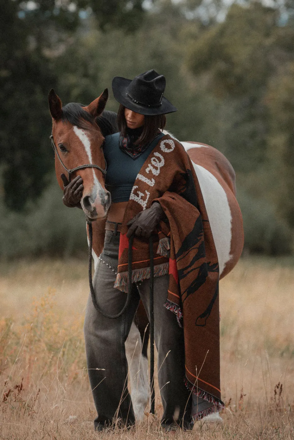 A spacious woven blanket with a stallion graphic, Elwood logo hit and fringe detailing. Add rustic flair to your space, or cozy up with it. Available in Rust.